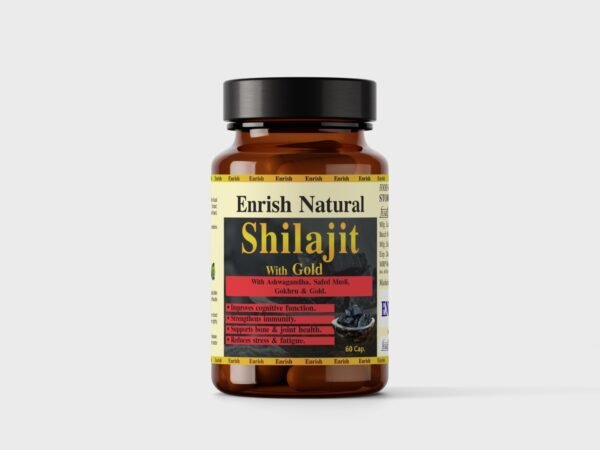 Enrish Natural Shilajit with Gold is a premium Ayurvedic supplement formulated using pure Himalayan Shilajit resin combined with Swarn Bhasma (Gold), Ashwagandha, Safed Musli, and Gokshura. This powerful blend is designed to naturally boost energy levels, improve stamina, and support overall physical performance.
