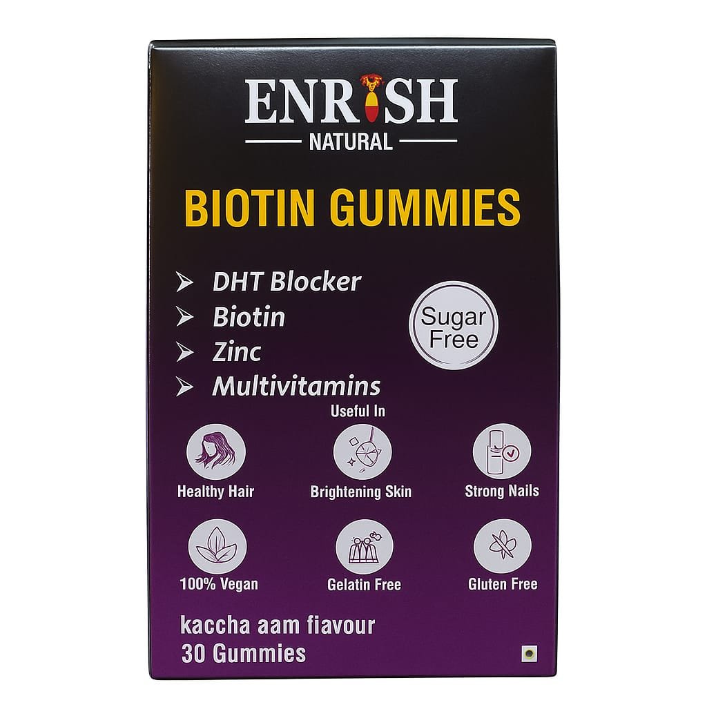 Boost your daily beauty routine with Enrish Natural Biotin Gummies, formulated to support stronger hair, glowing skin, and healthier nails. Made with premium biotin and essential vitamins, these delicious gummies help reduce hair fall, improve skin texture, and strengthen brittle nails — naturally and safely.